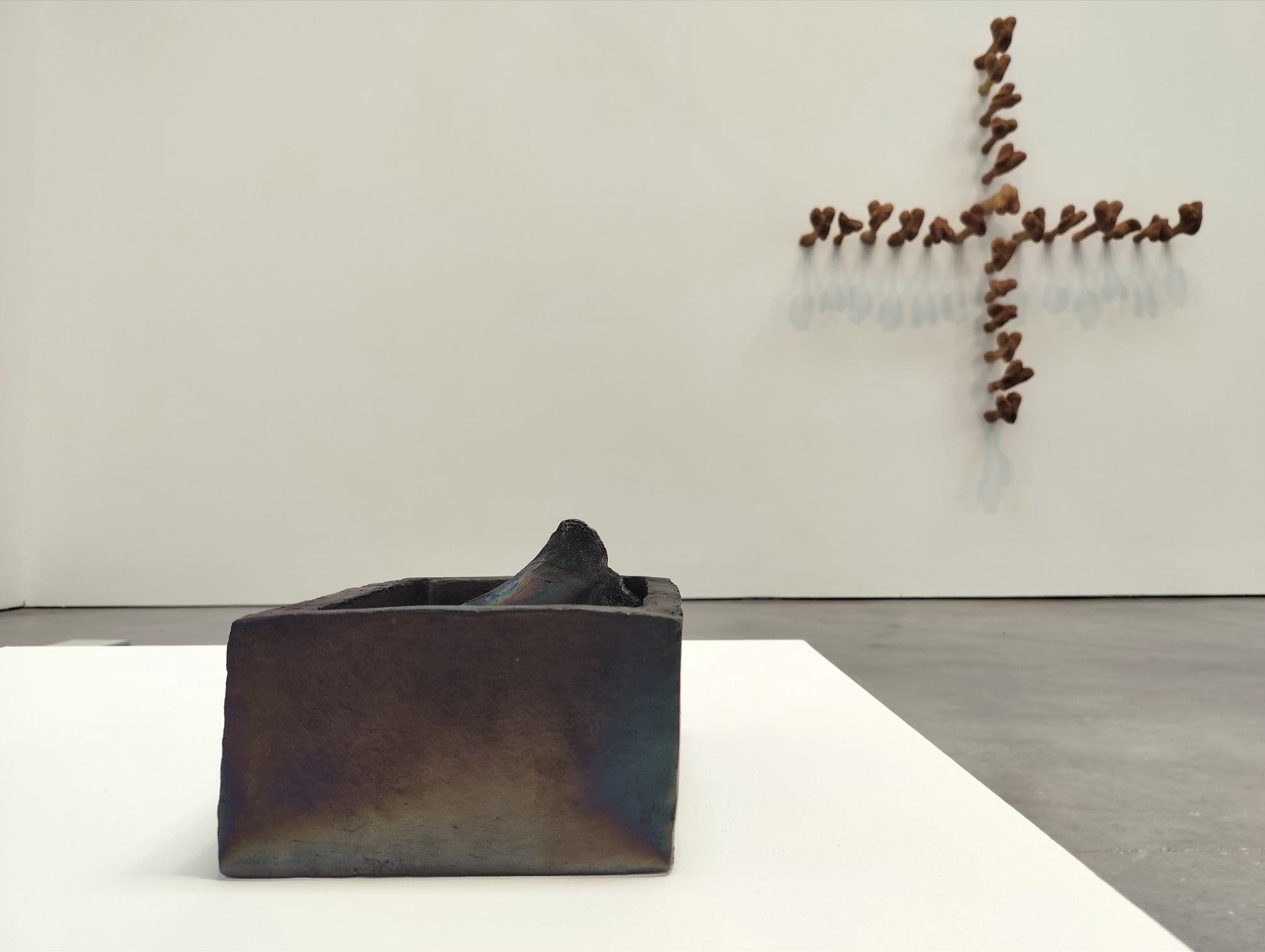 En la sala central de Huarte encontramos una urna rectangular colocada sobre un pedestal. Dentro de ella, reposan huesos de tibia y peroné calcinados. No es una representación escultórica, son los restos auténticos de una yegua para consumo humano. La caja monumental ha sido sometida a un alto nivel de combustión y tras el intenso humo y hedor desprendido a quinientos grados, el resultado ha sido un nuevo conjunto extrañamente petrificado. Vemos el cubo de arcilla refractaria abierto cual reliquia, mostrando los huesos negros y brillantes, con un resplandor oleoso que recuerda a petróleo, a neumático, a gasoil sobre la superficie. ¿Podría ser igualmente un sarcófago albergando los restos de un ser humano?